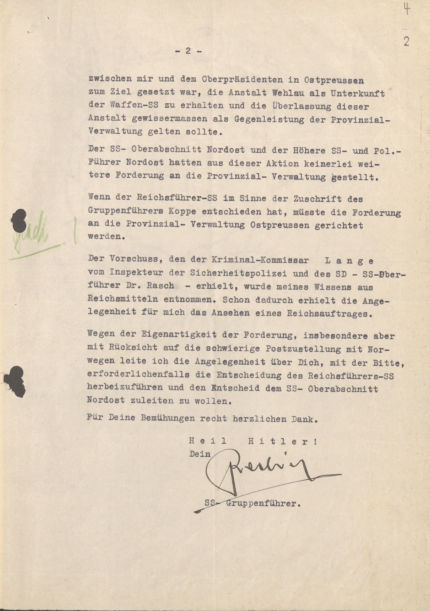 The SS Upper Section Northeast and the Higher SS and Police Leader Northeast made no further demands on the provincial administration from this action. If the Reichsführer-SS has decided in the sense of Gruppenführer Koppe’s letter, the demand should be directed to the Provincial Administration of East Prussia. [Brack]