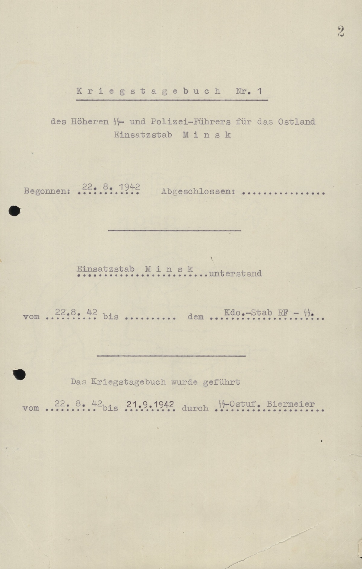 The war diary was kept from 22 August 1942 to 21 September 1942 by SS Obersturmführer Biermeier.