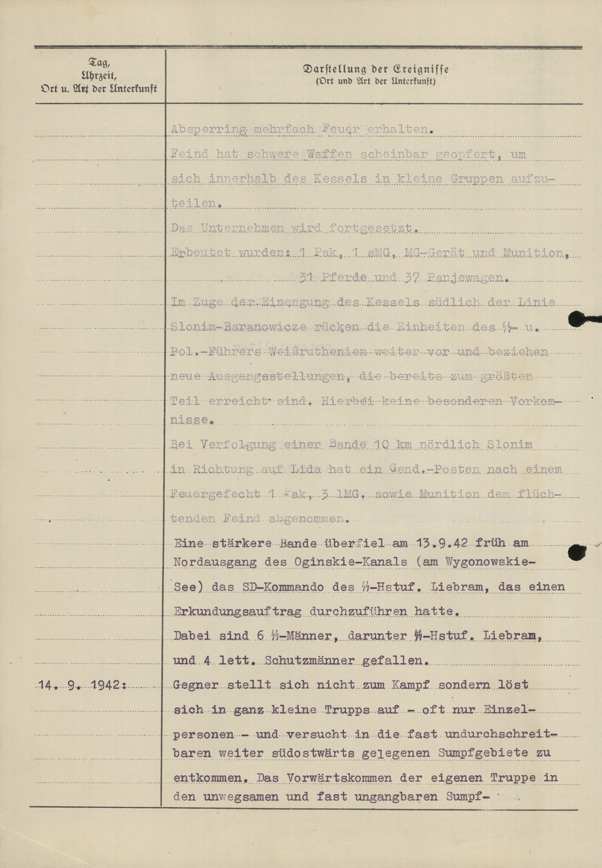Absperrung mehrfach Feuer erhalten. Feind hat schwere Waffen scheinbar geopfert, um sich innerhalb des Kessels in kleine Gruppen aufzuteilen. Das Unternehmen wird fortgesetzt. Erbeutet wurden 1 Pak, 1 s.M.G., MG-Gerät und Munition, 31 Pferde und 37 Panjewagen. Im Zuge der Einengung des Kessels südlich der Linie Slonim–Baranowicze rücken die Einheiten des SS- u. Pol.-Führers Weißruthenien weiter vor und beziehen neue Ausgangsstellungen, die bereits zum größten Teil erreicht sind. Hierbei keine besonderen Vorkommnisse. Bei Verfolgung einer Bande 10 km nördlich Slonim in Richtung auf Lida hat ein Gend.-Posten nach einem Feuergefecht 1 l.M.G., 3 l.M.G., sowie Munition dem flüchtenden Feind abgenommen. Eine stärkere Bande überfiel am 13.9.42 früh am Nordausgang des Oginskie-Kanals (am Wygonowskie-See) das SD-Kommando des SS-Hstuf. Liebram, das einen Erkundungsauftrag durchzuführen hatte. Dabei sind 6 SS-Männer, darunter SS-Hstuf. Liebram, und 4 lett. Schutzmänner gefallen.