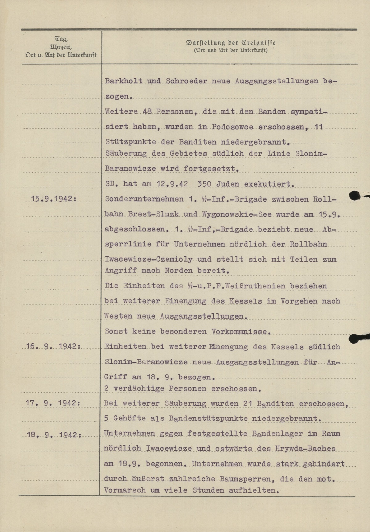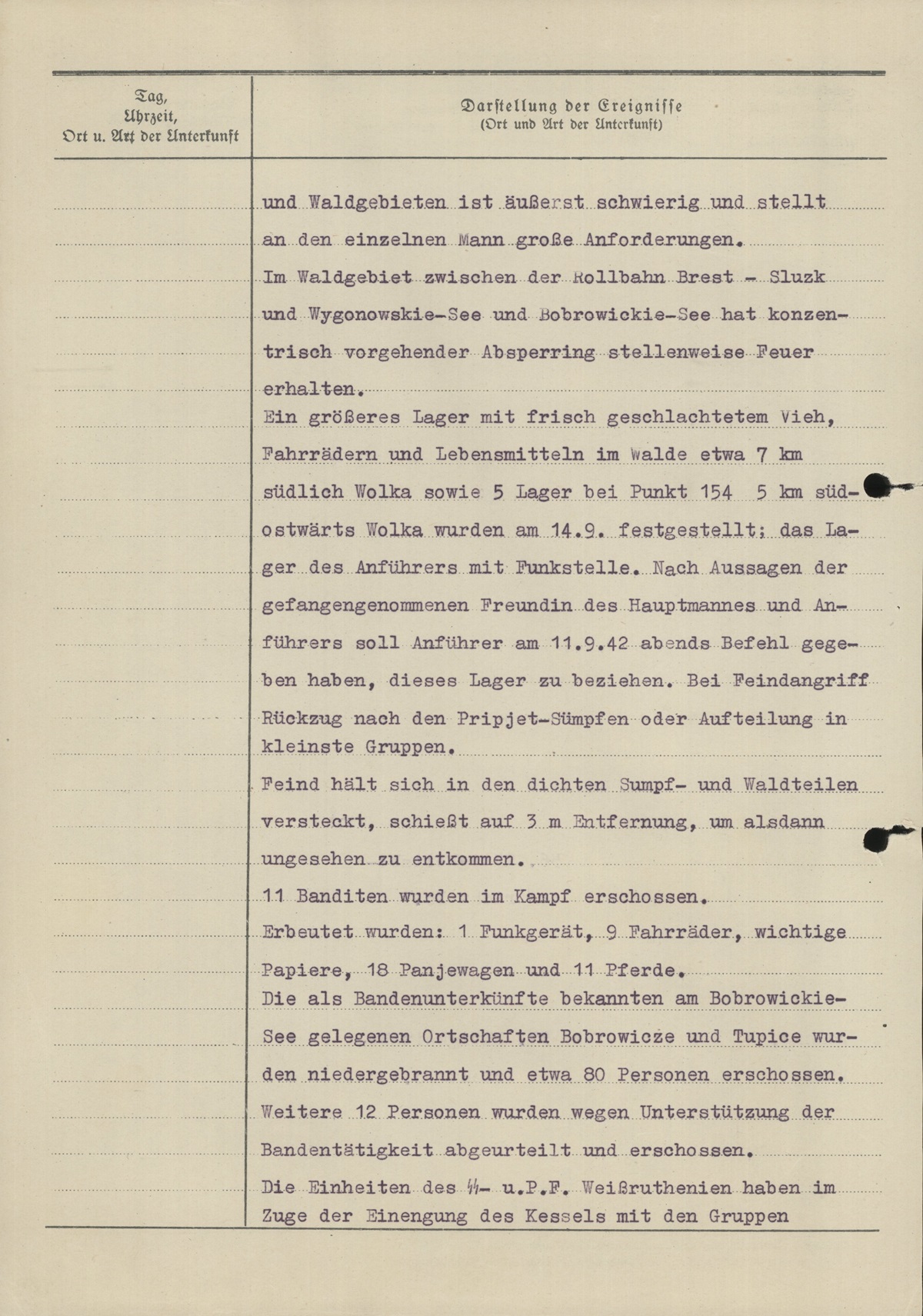 Gegner stellt sich nicht zum Kampf, sondern löst sich in ganz kleine Trupps auf, oft nur Einzelerpersonen, und versucht in die fast undurchschreitbaren weiter südostwärts gelegenen Sumpfgebiete zu entkommen. Das Vorwärtskommen der eigenen Truppe in den unwegsamen und fast ungangbaren Sumpf- und Waldgebieten ist äußerst schwierig und stellt an den einzelnen Mann große Anforderungen. Im Waldgebiet zwischen der Rollbahn Brest–Sluzk und Wygonowskie-See und Bobrowickie-See hat konzentrisch vorgehender Absperrung stellenweise Feuer erhalten. Ein größeres Lager mit frisch geschlachtetem Vieh, Fahrrädern und Lebensmitteln im Walde etwa 7 km südlich Wolka sowie 5 Lager bei Punkt 154 5 km südostwärts Wolka wurden am 14.9. festgestellt; das Lager des Anführers mit Funkstelle. Nach Aussagen der gefangen genommenen Freundin des Hauptmannes und Anführers soll Anführer am 11.9.42 abends Befehl gegeben haben, dieses Lager zu beziehen. Bei Feindangriff Rückzug nach den Pripjet-Sümpfen oder Aufteilung in kleinste Gruppen. Feind hält sich in den dichten Sumpf- und Waldteilen versteckt, schießt auf 3 m Entfernung, um alsdann ungesehen zu entkommen. 11 Banditen wurden im Kampf erschossen. Erbeutet wurden: 1 Funkgerät, 9 Fahrräder, wichtige Papiere, 18 Panjewagen und 11 Pferde. Die als Bandenunterkünfte bekannten am Bobrowickie-See gelegenen Ortschaften Bobrowicze und Tupice wurden niedergebrannt und etwa 80 Personen erschossen. Weitere 12 Personen wurden wegen Unterstützung der Bandentätigkeit abgeurteilt und erschossen. Die Einheiten des SS-u.P.F. Weißruthenien haben im Zuge der Einengung des Kessels mit den Gruppen Barkholt und Schroeder neue Ausgangsstellungen bezogen. Weitere 48 Personen, die mit den Banden sympathisiert haben, wurden in Podosowce erschossen, 11 Stützpunkte der Banditen niedergebrannt, Säuberung des Gebietes südlich der Linie Slonim–Baranowicze wird fortgesetzt. SD hat am 12.9.42 350 Juden exekutiert.