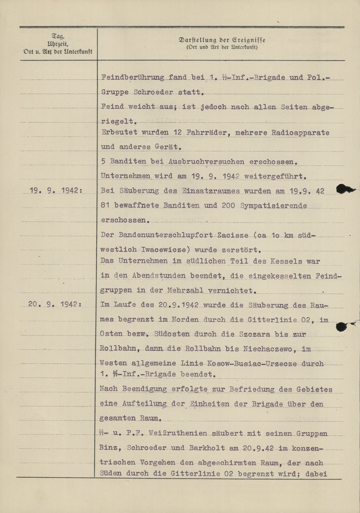 Feindberührung fand bei 1. SS-Inf.-Brigade und Pol.-Gruppe Schroeder statt. Feind weicht aus, ist jedoch nach allen Seiten abgeriegelt. Erbeutet wurden 12 Fahrräder, mehrere Radioapparate und anderes Gerät. 5 Banditen bei Ausbruchsversuchen erschossen. Unternehmen wird am 19.9.1942 weitergeführt.