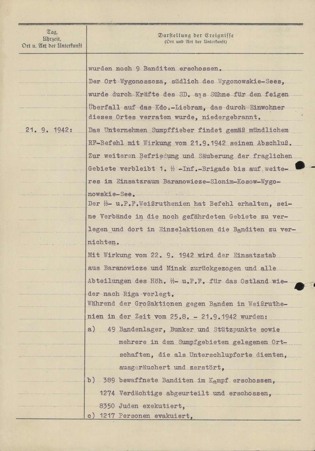 Das Unternehmen Sumpffieber findet gemäß mündlichem RF-Befehl mit Wirkung vom 21.9.1942 seinen Abschluss. Zur weiteren Befriedung und Säuberung der fraglichen Gebiete verbleibt 1. SS-Inf.-Brigade bis auf weiteres im Einsatzraum Baranowicze–Slonim–Kosow–Wygonowskie-See.