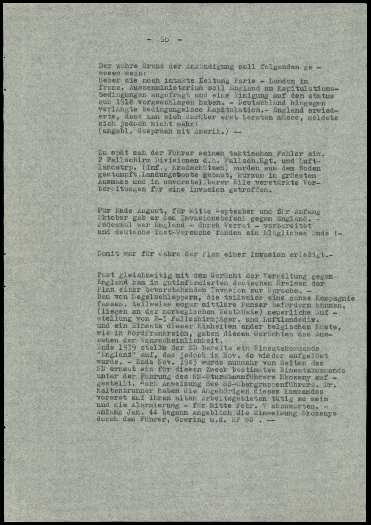 Thus, for years, the plan of invading Britain was dropped. Later, during a wave of rumors about retaliation against England, talk of a renewed invasion plan resurfaced in well-informed German circles. The construction of towable sailing barges (some capable of carrying a full company or even medium tanks) — stationed along Norway’s west coast — along with the formation of two or three new airborne and air-landing divisions, and their deployment to the Belgian coast and northern France, made the rumors seem plausible. As early as late 1939, the SD formed a special task force “England”, which was disbanded in November 1940. However, in late November 1943, the SD re-formed a similar task force, now under the command of SS-Sturmbannführer Skorzeny. Following orders from SS-Obergruppenführer Dr. Kaltenbrunner, the members of this new unit were to continue their usual activities until alerted around mid-February. In early January 1944, Skorzeny reportedly began briefings with Hitler, Goering, and the Reichsführer-SS in preparation for the mission.