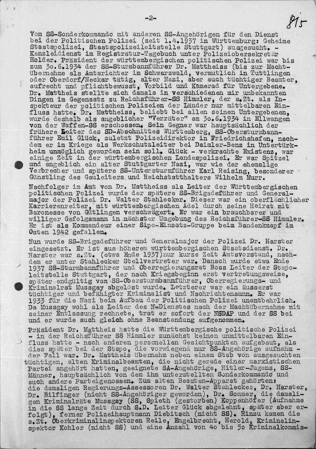Präsident Dr. Mattheiss hatte die württembergische politische Polizei – in der Reichsführer SS Himmler zunächst keinen unmittelbaren Einfluß hatte – nach anderen personellen Gesichtspunkten aufgebaut, als dies später bei der Staatspolizei, die vorwiegend nur SS-Angehörige aufnahm, der Fall war. Dr. Mattheiss übernahm neben einem Stab von ausgesuchten tüchtigen, alten Kriminalbeamten, die nicht gerade einer marxistischen Partei angehört hatten, geeignete SA- Angehörige, Hitler-Jungens, SS-Männer, hauptsächlich von dem ihm unterstellten Sonderkommando, und auch andere Parteigenossen. Zum alten Beamtenapparat gehörten: die damaligen Regierungs-Assessoren Dr. Walther Stahlecker, Dr. Harster, Dr. Bilfinger (nicht SS-Angehöriger geworden), Dr. Sommer, die damaligen Kriminalräte Mussgay (SS), Spieth (gestorben), Koppenhöfer (Aufnahme in die SS lange Zeit durch SD-Leiter Glück abgelehnt, später aber erfolgt), ferner Polizeihauptmann Diebisch (nicht SS). Hinzu kamen die Oberkriminalinspektoren Reile, Engelbrecht, Herold, Kriminalinspektor Kohler (nicht SS) und eine Anzahl von 40 bis 50 Kriminalkommissaren (später Sekretär nach Übernahme beziehungsweise Vereinheitlichung der Polizei am 1.4.1937). Nach Ableben von Dr. Mattheiss hat sein Nachfolger Dr. Stahlecker außer einigen tüchtigen, alten Berufsbeamten, die nicht alle in die SS aufgenommen wurden, fest nur noch SS-Angehörige in den Dienst der politischen Polizei gestellt, wie ihm dies vom Reichsführer SS Himmler nahegelegt worden war, obwohl letzterer damals noch keine Befehlsgewalt im staatsrechtlichen Sinne über die württembergische politische Polizei hatte.