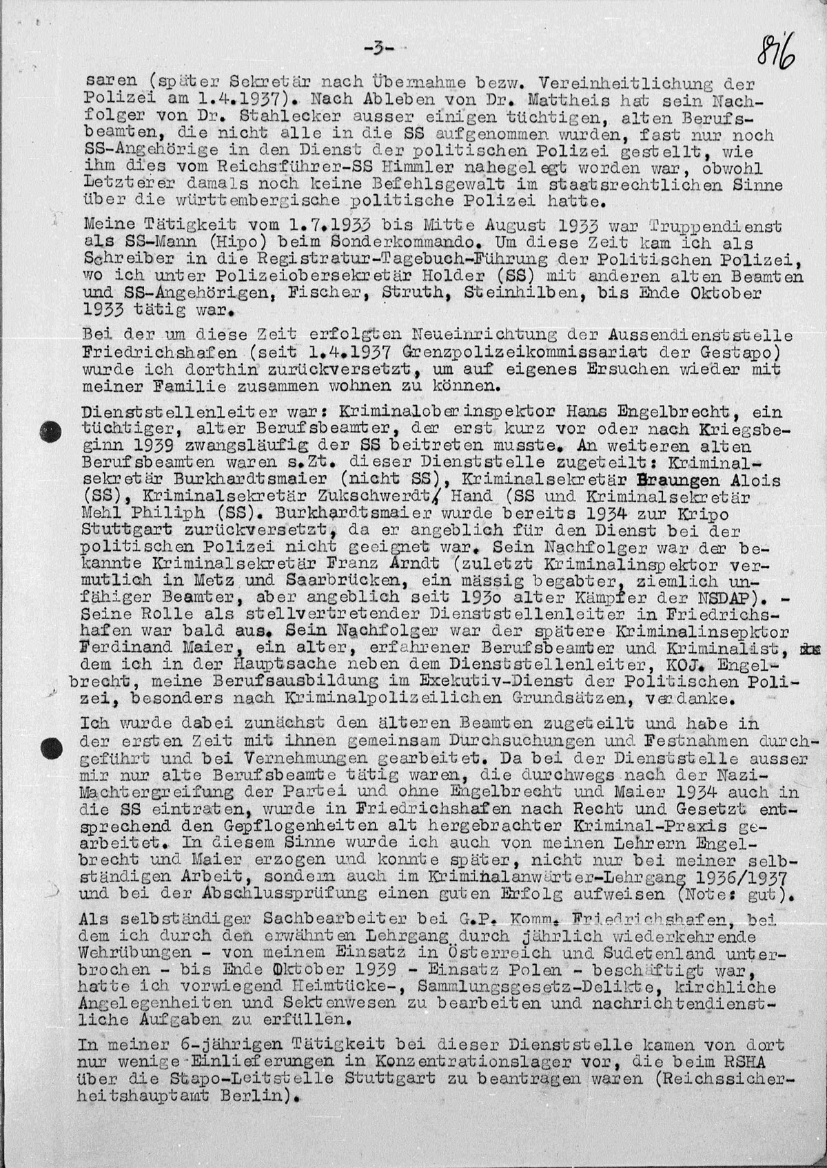 Ich wurde dabei zunächst den älteren Beamten zugeteilt und habe in der ersten Zeit mit ihnen gemeinsam Durchsuchungen und Festnahmen durchgeführt und bei Vernehmungen gearbeitet. Da bei der Dienststelle, außer mir, nur alte Berufsbeamte tätig waren, die durchwegs nach der Nazi-Machtergreifung der Partei und ohne Engelbrecht und Maier 1934 auch in die SS eintraten, wurde in Friedrichshafen nach Recht und Gesetz entsprechend den Geflogenheiten althergebrachter Kriminalpraxis gearbeitet. In diesem Sinne wurde ich auch von meinem Lehrern Engelbrecht und Maier erzogen und konnte später, nicht nur bei meiner selbständigen Arbeit, sondern auch im Kriminalanwärter-Lehrgang 1936/1937 und bei der Abschlußprüfung, einen guten Erfolg aufweisen (Note: gut).