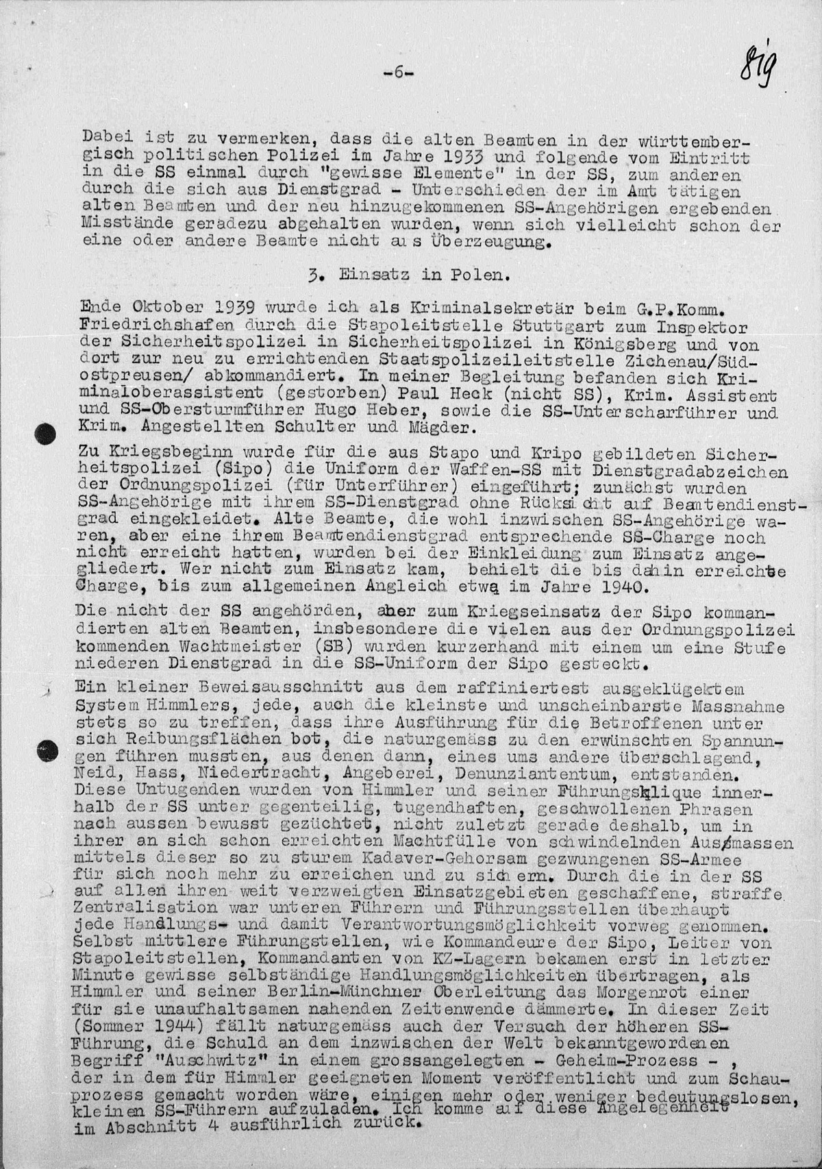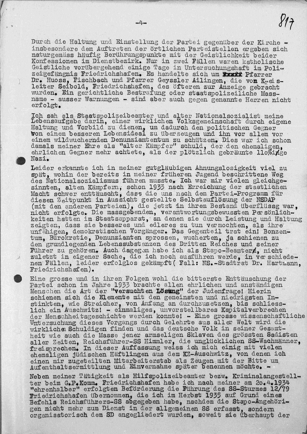 Eine große und in ihren Folgen wohl die bitterste Enttäuschung der Partei schon im Jahre 1933 brachte allen ehrlichen und anständigen Menschen die Art der »versuchten Lösung« der Judenfrage! Hierin schienen sich die Elemente mit den gemeinsten und niedrigsten Instinkten, wie Streicher, von Anfang an durchzusetzen, bis schließlich ein Auschwitz! – einmaliges, unvorstellbares Kapitalverbrechen der Menschheitsgeschichte – werden konnte! Eine große wissenschaftliche Untersuchung dieses Vorgangs durch Gelehrte aus aller Welt wird die wirklich Schuldigen finden und das deutsche Volk in seiner Gesamtheit wie auch die Masse jener armseligen Sklaven des größten Sadisten aller Zeiten, Reichsführer SS Himmler, die unglücklichen SS-Wachmänner, freisprechen. In dieser Auffassung weiß ich mich einig mit vielen ehemaligen jüdischen Häftlingen aus dem Konzentrationslager Auschwitz, von denen ich einen mir zugeteilten Mitarbeiterstab als Zeugen mit der Bitte um Aufenthaltsermittlung und Einvernahme später benennen möchte. Neben meiner Tätigkeit als Hilfspolizeibeamter bzw. Kriminalangestellter beim G.P. Komm. Friedrichshafen habe ich nach meiner am 20.4.1934 »ehrenhalber« erfolgten Beförderung die Führung des SS-Sturmes 12/79 Friedrichshafen übernommen, die ich im Herbst 1935 auf Grund eines Befehls Reichsführers SS abgegeben habe, nachdem die Staatspolizei-Angehörigen nicht mehr zum Dienst in der Allgemeinen SS erfaßt, sondern organisatorisch dem SD angegliedert wurden, soweit sie überhaupt der SS angehörten oder neu aufgenommen wurden.