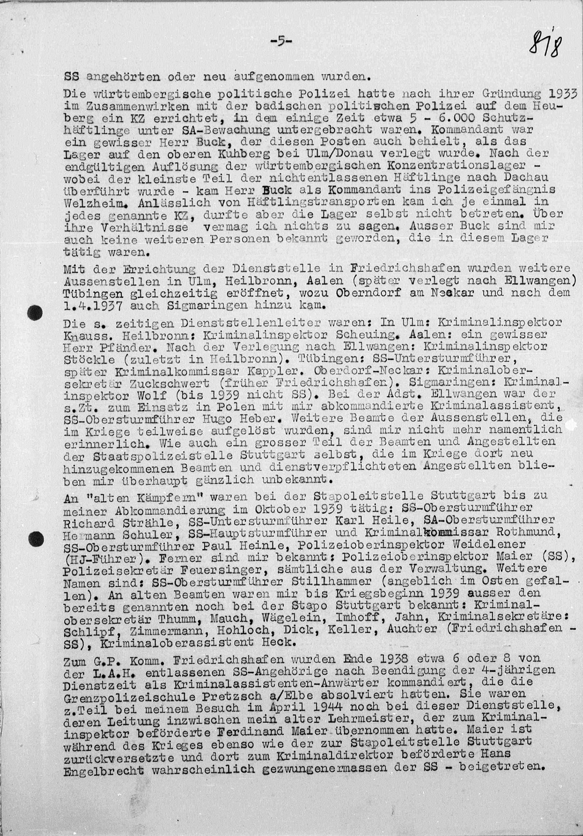 Die s.zeitigen Dienstellenleiter waren: In Ulm: Kriminalinspektor Knauss. Heilbronn: Kriminalinspektor Scheuing. Aalen: ein gewisser Herr Pfänder. Nach der Verlegung nach Ellwangen: Kriminalinspektor Stöckle (zuletzt in Heilbronn). Tübingen: SS-Untersturmführer, später Kriminalkommissar Kappler. Oberndorf/Neckar: Kriminalobersekretär Zuckschwert (früher Friedrichshafen). Sigmaringen: Kriminalinspektor Wolf bis 1939 nicht SS). Bei der Außendienststelle Ellwangen war der seiner Zeit zum Einsatz in Polen mit mir abkommandierte Kriminalassistent, SS-Obersturmführer Hugo Heber. Weitere Beamte der Außenstellen, die im Kriege teilweise aufgelöst wurden, sind mir nicht mehr namentlich erinnerlich. Wie auch ein großer Teil der Beamten und Angestellten der Staatspolizeistelle Stuttgart selbst, die im Kriege dort neu hinzugekommenen Beamten und dienstverpflichteten Angestellten blieben mir überhaupt namentlich unbekannt.