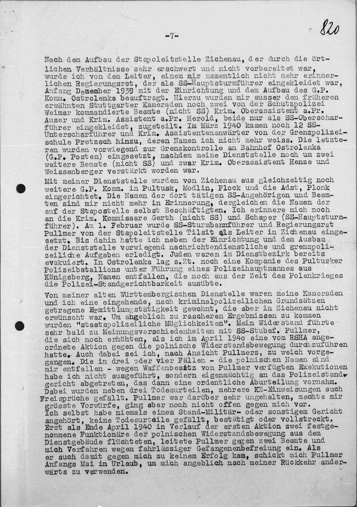 Von meiner alten württembergischen Dienststelle waren meine Kameraden und ich eine eingehende, nach kriminalpolizeilichen Grundsätzen getragene Ermittlungstätigkeit gewohnt, die aber in Zichenau nicht erwünscht war. Um angeblich zu rascheren Ergebnissen zu kommen wurden »staatspolizeiliche Möglichkeiten« [sic]. Mein Widerstand führte sehr bald zu Meinungsverschiedenheiten mit SS-Sturmbannführer Pullmer, die sich noch erhöhten, als ich im April 1940 eine vom RSHA angeordnete Aktion gegen die polnische Widerstandsbewegung durchzuführen hatte. Auch dabei sei ich, nach Ansicht Pullmers, zu weich vorgegangen. Die in drei oder vier Fällen – die polnischen Namen sind mir entfallen – wegen Waffenbesitz von Pullmer verfügten Exekutionen habe ich nicht ausgeführt, sondern eigenmächtig an das Polizeistandgericht abgetreten, das dann eine ordentliche Aburteilung vornahm. Dabei wurden neben drei Todesurteilen mehrere Konzentrationslager-Einweisungen und auch Freisprüche gefällt. Pullmer war darüber sehr ungehalten, machte mir größte Vorwürfe, ging aber noch nicht offen gegen mich vor.