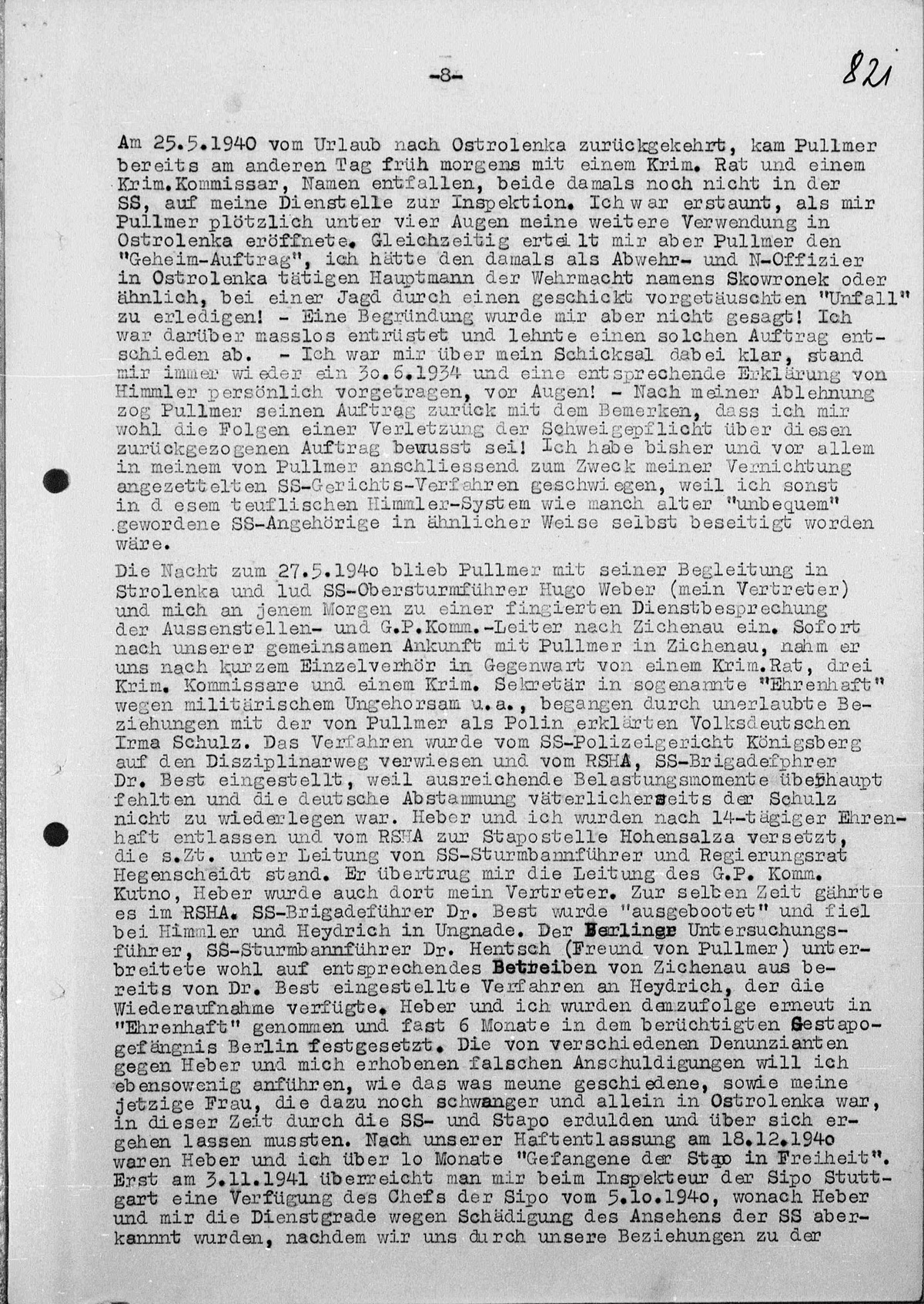 Am 25.5.1940 vom Urlaub nach Ostrolenka zurückgekehrt, kam Pullmer bereits am anderen Tag frühmorgens mit einem Kriminalrat und einem Kriminalkommissar, Namen entfallen, beide damals noch nicht in der SS, auf meine Dienststelle zur Inspektion. Ich war erstaunt, als mir Pullmer plötzlich unter vier Augen meine weitere Verwendung in Ostrolenka eröffnete. Gleichzeitig erteilt mir aber Pullmer den »Geheim-Auftrag«, ich hätte den damals als Abwehr- und N-Offizier in Ostrolenka tätigen Hauptmann der Wehrmacht namens Skowronek oder ähnlich bei einer Jagd durch einen geschickt vorgetäuschten »Unfall« zu erledigen! – Eine Begründung wurde mir aber nicht gesagt! Ich war darüber maßlos entrüstet und lehnte einen solchen Auftrag entschieden ab. – Ich war mir über mein Schicksal dabei klar, stand mir immer wieder ein 30.6.1934 und eine entsprechende Erklärung von Himmler persönlich vorgetragen, vor Augen! – Nach meiner Ablehnung zog Pullmer seinen Auftrag zurück mit dem Bemerken, daß ich mir wohl der Folgen einer Verletzung der Schweigepflicht über diesen zurückgezogenen Auftrag bewußt sei! Ich habe bisher und vor allem in meinem vom Pullmer anschließend zum Zweck meiner Vernichtung angezettelten SS-Gerichts-Verfahren geschwiegen, weil ich sonst in dessen teuflischem Himmler-System wie manch alter »unbequem« gewordene SS-Angehörige in ähnlicher Weise selbst beseitigt worden wäre.