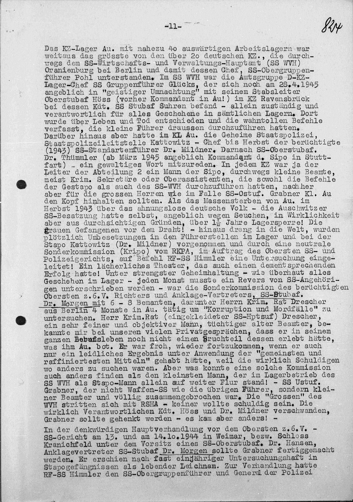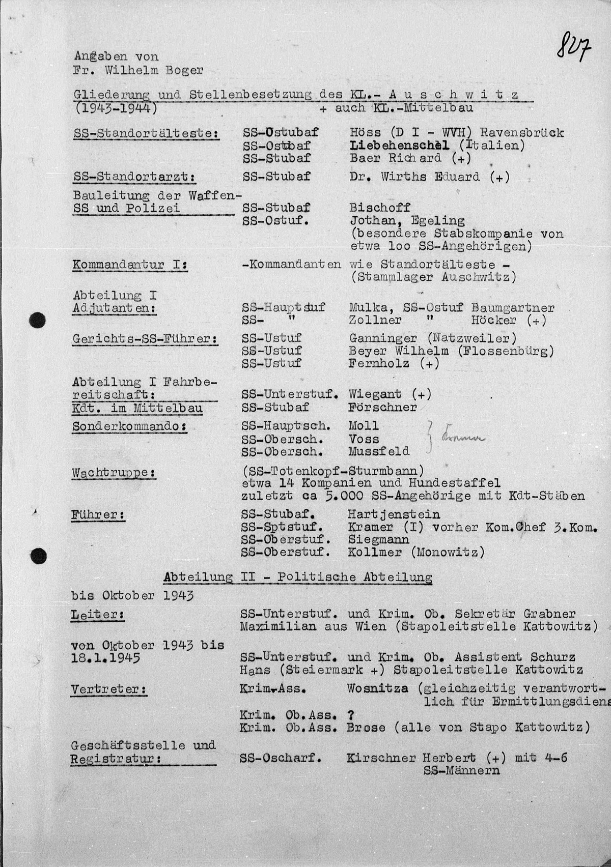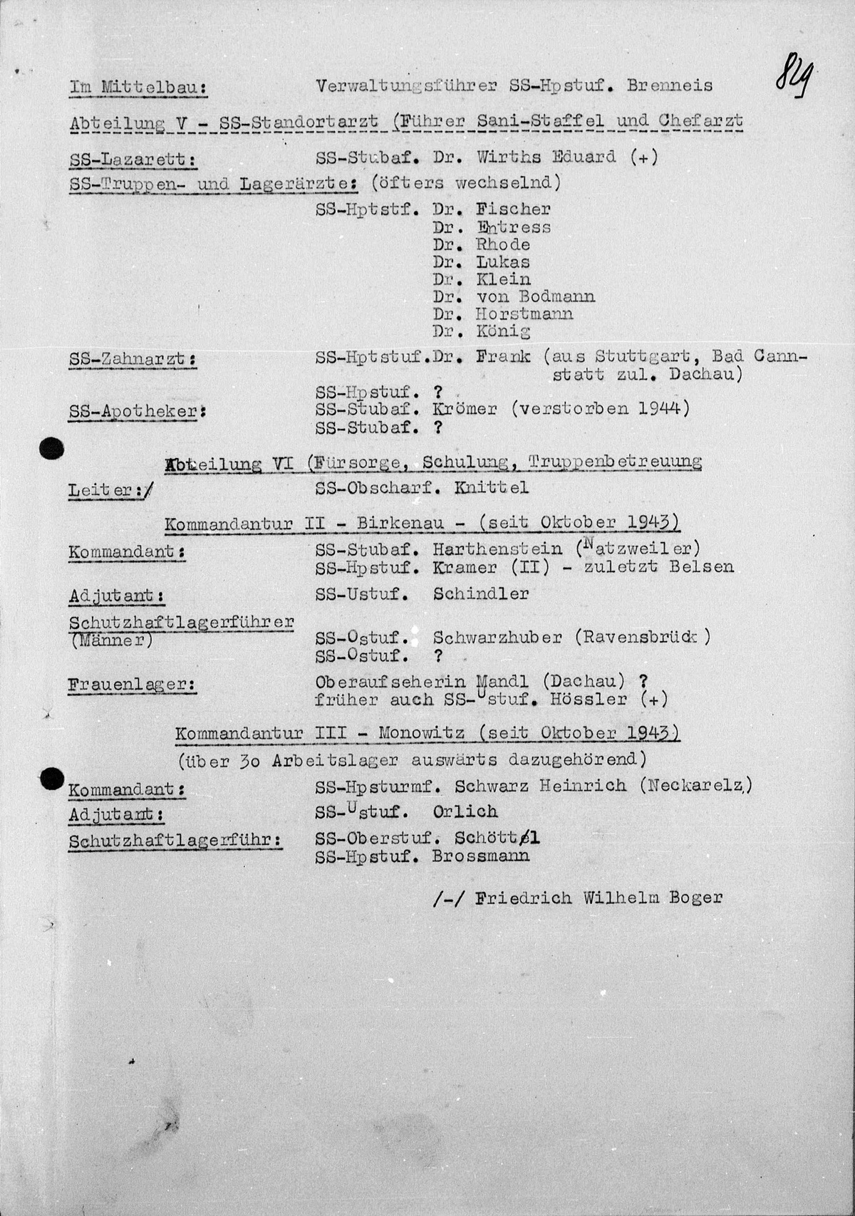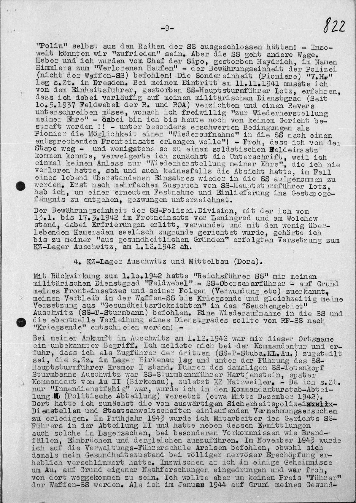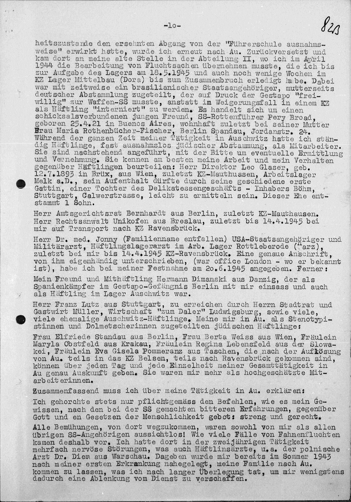 Bei meiner Ankunft in Auschwitz am 1.12.1942 war mir dieser Ortsname ein unbekannter Begriff. Ich meldete mich bei der Kommandantur und erfuhr, daß ich als Zugführer der dritten (SS-T-Stuba.KL Au.) [sic] zugeteilt sei, die s.Zt. im Lager Birkenau lag und unter der Führung des SS-Hauptsturmführers Kramer […] stand. Führer des damaligen SS-Totenkopf- Sturmbanns Auschwitz war SS-Sturmbannführer Hartjenstein, später Kommandant von Au II (Birkenau), zuletzt KZ Natzweiler. Da ich s. Zt. nur »innendienstfähig« war, wurde ich in den Kommandanturstab-Abteilung II (Politische Abteilung) versetzt (etwa Mitte Dezember 1942). Dort hatte ich zunächst die von auswärtigen Sicherheitspolizei-Dienststellen und Staatsanwaltschaften einlaufenden Vernehmungsersuchen zu erledigen. Im Frühjahr 1943 wurde ich Mitarbeiter des Gerichts-SS-Führers in der Abteilung II und hatte neben dessen Ermittlungen auch solche in Lagersachen, bei besonderen Vorkommnissen wie Brandfällen, Einbrüchen und dergleichen auszuführen. Im November 1943 wurde ich auf die Verwaltungs-Führerschule Arolsen befohlen, obwohl sich damals mein Gesundheitszustand bei völliger nervöser Erschöpfung erheblich verschlimmert hatte. Inzwischen war ich in einige Geheimnisse um Au. auf Grund eigener Nachforschungen eingedrungen und war froh, von dort weggekommen zu sein. Ich wollte aber um keinen Preis »Führer« der Waffen-SS werden. Als ich im Januar 1944 auf Grund meines Gesundheitszustand dem ersehnten Abgang von der Führerschule »ausnahmsweise« erwirkt hatte, wurde ich erneut nach Au. zurückversetzt und kam dort an meine alte Stelle in der Abteilung II, wo ich im April 1944 die Bearbeitung von Fluchtsachen übernehmen mußte, die ich bis zur Aufgabe des Lagers am 18.5.1945 [sic] und auch noch wenige Wochen im KZ Lager Mittelbau (Dora) bis zum Zusammenbruch erledigt habe. Dabei war mir zeitweise ein brasilianischer Staatsangehöriger, mutterseits deutscher Abstammung, zugeteilt, der auf Druck der Gestapo »freiwillig« zur Waffen-SS mußte, anstatt im Weigerungsfall in ein Konzentrationslager als Häftling »interniert« zu werden. Es handelt sich um einen schicksalsverbundenen jungen Freund, SS-Rottenführer Pery Broad, geboren am 25.4.21 in Buenos Aires, wohnhaft zuletzt bei seiner Mutter Frau Maria Rothenbücher-Fischer, Berlin-Spandau, Jordanstr. 24. Während der ganzen Zeit meiner Tätigkeit in Auschwitz hatte ich ständig Häftlinge, fast ausnahmslos jüdischer Abstammung, als Mitarbeiter. Sie sind nachstehend angeführt, mit der Bitte um eventuelle Ermittlung und Vernehmung. Sie können am besten meine Arbeit und mein Verhalten gegenüber Häftlingen beurteilen: Herr Direktor Leo Glaser, geb. 12.7.93 in Brüx, aus Wien, zuletzt KZ Mauthausen, Arbeitslager Melk a.D., sein Aufenthalt dürfte durch seine geschiedene erste Gattin, einer Tochter des Delikatessengeschäfts-Inhabers Böhm, Stuttgart, Calwerstraße, leicht zu ermitteln sein. Dieser Ehe entstammt ein Sohn.