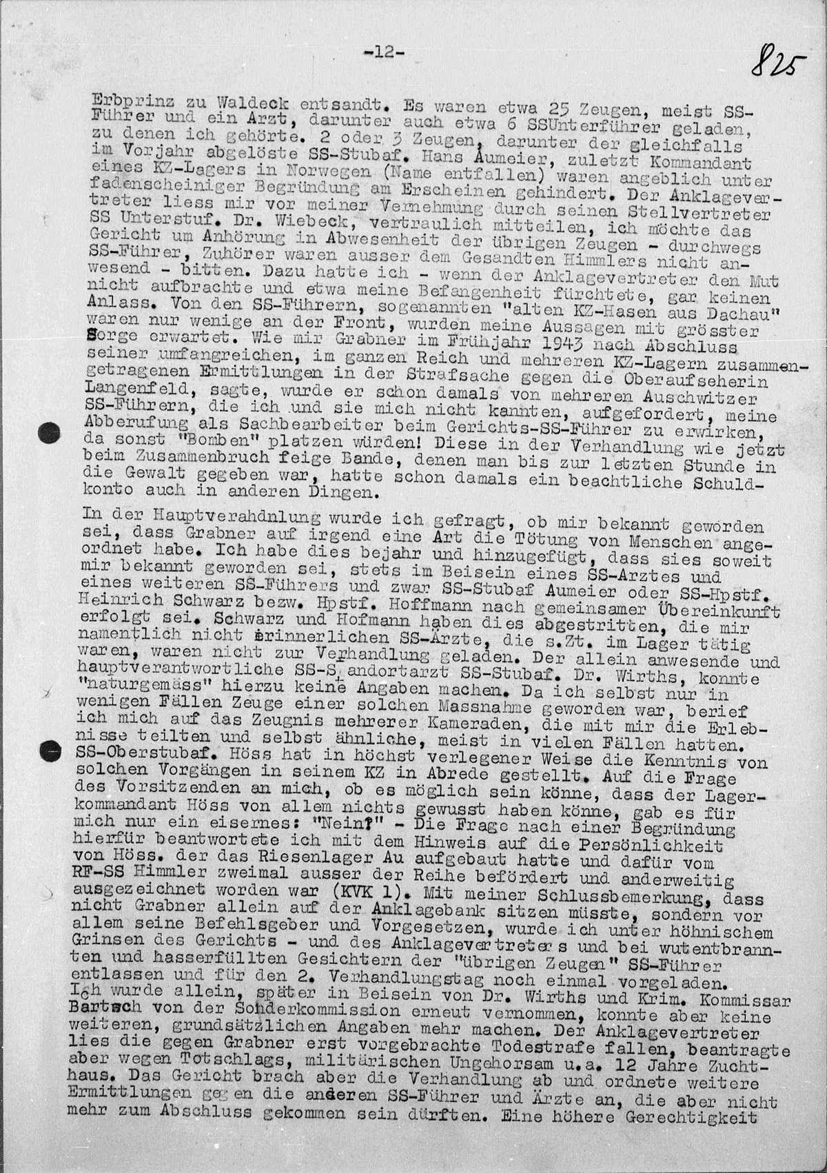 Mit meiner Schlußbemerkung, daß nicht Grabner allein auf der Anklagebank sitzen müßte, sondern vor allem seine Befehlsgeber und Vorgesetzten, wurde ich unter höhnischem Grinsen des Gerichts- und des Anklagevertreters und bei wutentbrannten und haßerfüllten Gesichtern der »übrigen Zeugen« SS-Führer entlassen und für den zweiten Verhandlungstag noch einmal vorgeladen. Ich wurde allein, später im Beisein von Dr. Wirths und Krim.Kommissar Bartsch, von der Sonderkommission erneut vernommen, konnte aber keine weiteren, grundsätzlichen Angaben mehr machen. Der Anklagevertreter ließ die gegen Grabner erst vorgebrachte Todesstrafe fallen, beantragte aber wegen Totschlags, militärischen Ungehorsam u.a. 12 Jahre Zuchthaus. Das Gericht brach aber die Verhandlung ab und ordnete weitere Ermittlungen gegen die anderen SS-Führer und Ärzte an, die aber nicht mehr zum Abschluß gekommen sein dürften. Eine höhere Gerechtigkeit hat es im Falle Grabner verhindert, daß er als kleiner Mann für Himmler im geeigneten Moment als Sündenbock gegenüber der Öffentlichkeit [dastand]. – Bezeichnend war nach der Grabner-Verhandlung die mir von Dr. Wiebeck erteilte Vorsichtsmahnung von der Rache meiner Vorgesetzten!