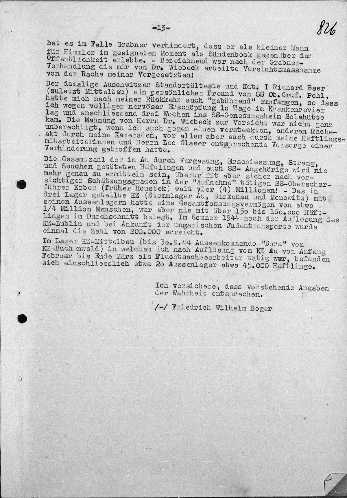 Die Gesamtzahl der in Au. durch Vergasung, Erschießung, Strang und Seuchen getöteten Häftlinge und auch SS-Angehörige wird nie mehr genau zu ermitteln sein, übertritt [sic] aber sicher nach vorsichtiger Schätzung des in der »Aufnahme« tätigen SS-Oberscharf. Erber (früher Houstek), weit vier (4) Millionen! – Das in drei Lager geteilte KZ (Stammlager Au., Birkenau und Monowitz) mit seinen Außenlagern hatte ein Gesamtfassungsvermögen von etwa 1/4 Million Menschen, war aber nie mit über 150 bis 160.000 Häftlingen im Durchschnitt belegt. Im Sommer 1944 nach der Auflösung des KZ Lublin und bei Ankunft der ungarischen Judentransporte wurde einmal die Zahl von 200.000 erreicht.