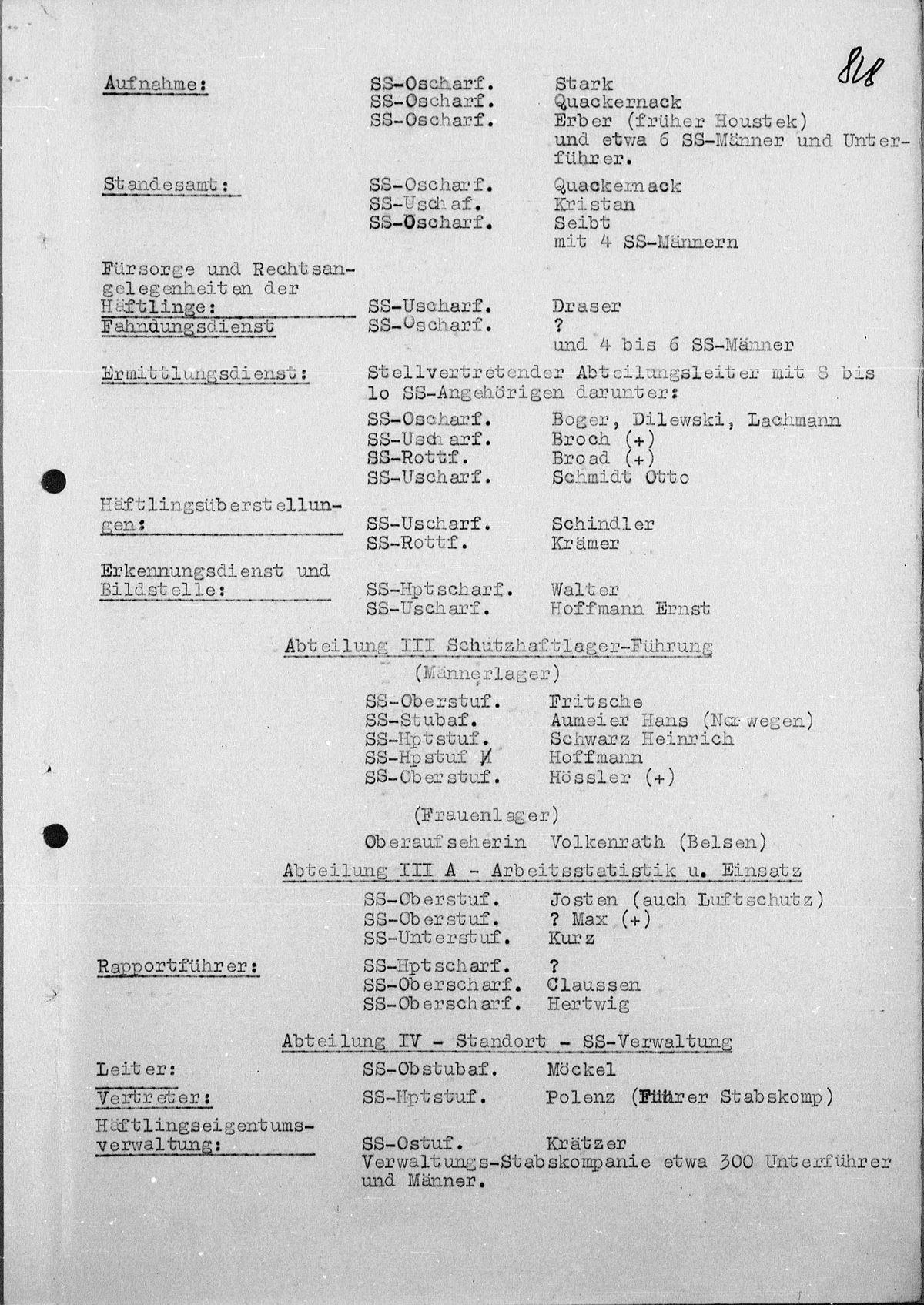Frau Elfriede Spandau aus Berlin, Frau Berta Weiss aus Wien, Fräulein Maryla Obstfeld [Rosenthal] aus Krakau, Fräulein Regina Lebensfeld [Steinberg] aus der Slowakei, Fräulein Eva Gisela Pommeranz aus Teschen, die nach der Auflösung von Au. teils in das KZ Belsen, teils nach Ravensbrück gekommen sind, können über jeden Tag und jede Einzelheit meiner Gesamttätigkeit in Au. genau Auskunft geben. Sie waren mir mehr als hochgeschätzte Mitarbeiterinnen.