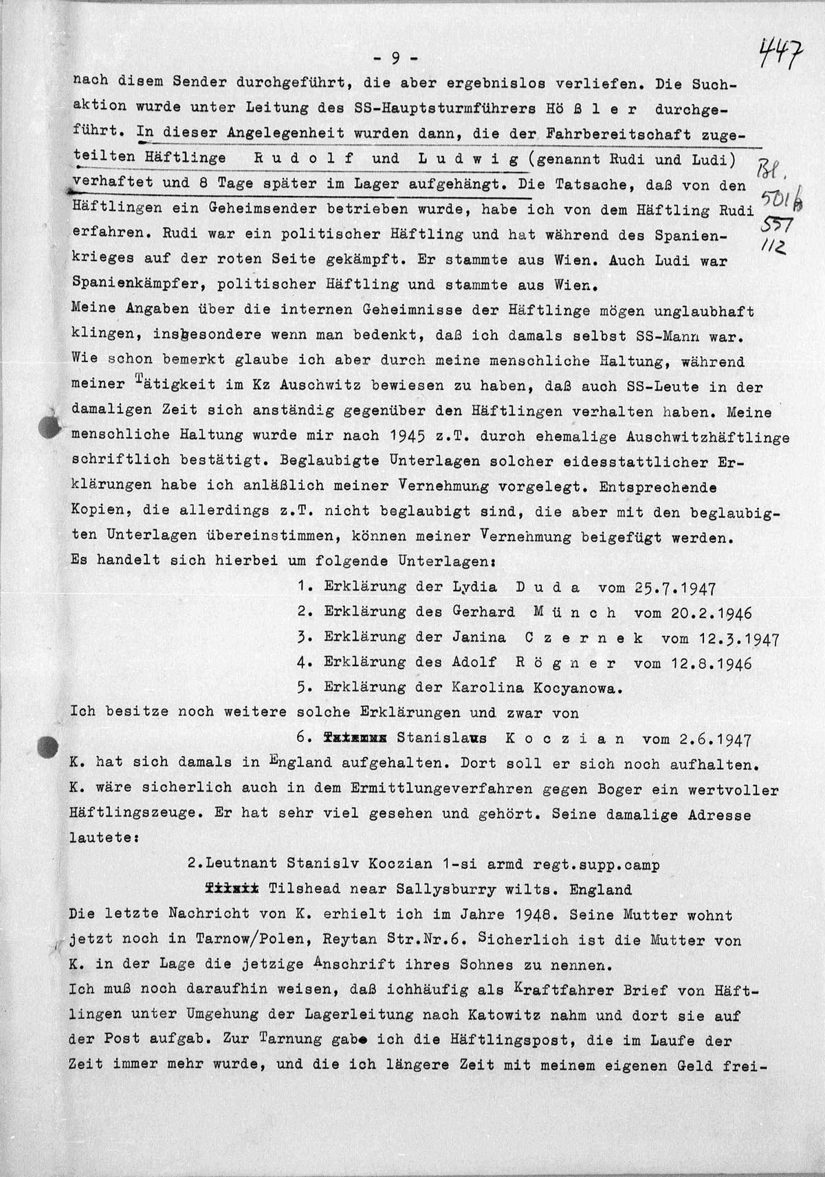 Im KZ-Lager Auschwitz soll auch – wie ich aus zuverlässiger Häftlingsquelle erfuhr – ein Sender von Häftlingen betrieben worden sein. Bei der Erstellung dieses Senders soll Rögner eine Rolle gespielt haben. Der SS war diese Tatsache bekanntgeworden und es wurden umfangreiche Suchaktionen nach diesem nach diesem Sender durchgeführt, die aber ergebnislos verliefen. Die Suchaktion wurde unter Leitung des SS-Hauptsturmführers Hößler durchgeführt. In dieser Angelegenheit wurden dann, die der Fahrbereitschaft zugeteilten Häftlinge Rudolf und Ludwig (genannt Rudi und Ludi) verhaftet und 8 Tage später im Lager aufgehängt. Die Tatsache, daß von den Häftlingen ein Geheimsender betrieben wurde, habe ich von dem Häftling Rudi erfahren. Rudi war ein politischer Häftling und hat während des Spanienkrieges auf der roten Seite gekämpft. Er stammte aus Wien. Auch Ludi war Spanienkämpfer, politischer Häftling und stammte aus Wien.