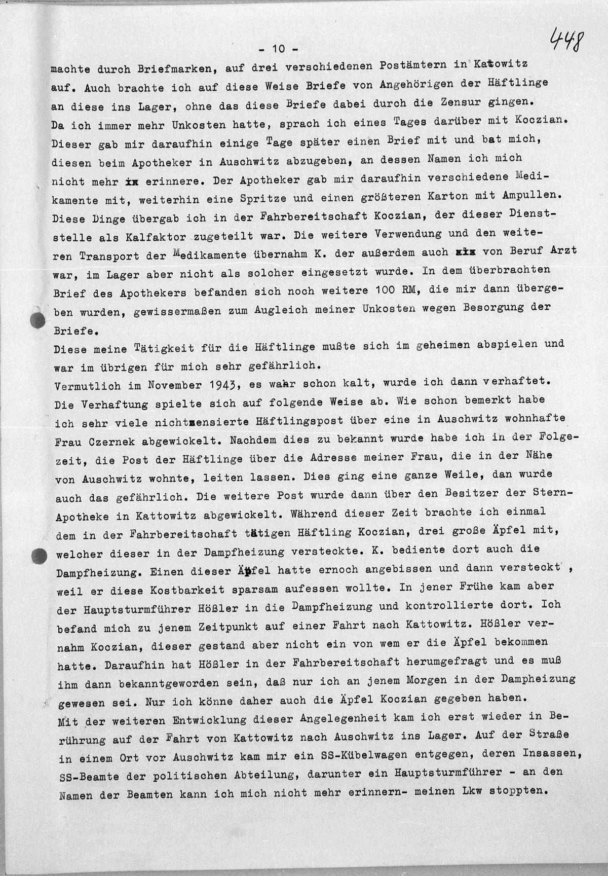 Da ich immer mehr Unkosten hatte, sprach ich eines Tages darüber mit Koczian. Dieser gab mir daraufhin einige Tage später einen Brief mit und bat mich, diesen beim Apotheker in Auschwitz abzugeben, an dessen Namen ich mich nicht mehr zu erinnern. Der Apotheker gab mir daraufhin verschiedene Medikamente mit, weiterhin eine Spritze und einen größeren Karton mit Ampullen. Diese Dinge übergab ich in der Fahrbereitschaft Koczian, der dieser Dienststelle als Kalfaktor zugeteilt war. Die weitere Verwendung und den weiteren Transport der Medikamente übernahm K., der außerdem auch von Beruf Arzt war, im Lager aber nicht als solcher eingesetzt wurde. In dem überbrachten Brief des Apothekers befanden sich noch weitere 100 RM, die mir dann übergeben wurden, gewissermaßen zum Ausgleich meiner Unkosten wegen Besorgung der Briefe.