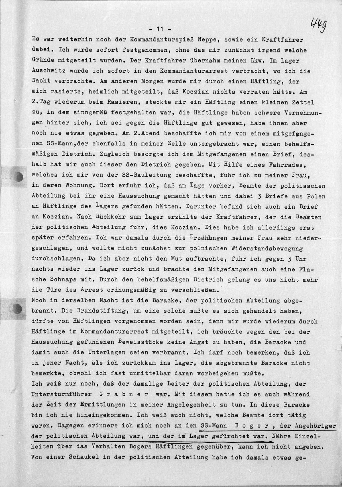 Nach wiederum 3 Wochen wurde ich von einem SS-Mann zu Grabner in die eine Blockführerstube gebracht, dort befand sich meine Frau mit Kind, die mich besuchte. Im Anschluß wurde ich von Grabner vernommen, wobei er mich besonders frug, ob ich in der Dampfheizung gewesen sei, was ich bestritt. Grabner erklärte ich dann auch die Herkunft der Brief aus Polen, mit der Bemerkung, ich sei im Polenfeldzug gewesen – was nicht stimmte – und dort kennengelernte Menschen würden mir immer noch schreiben.