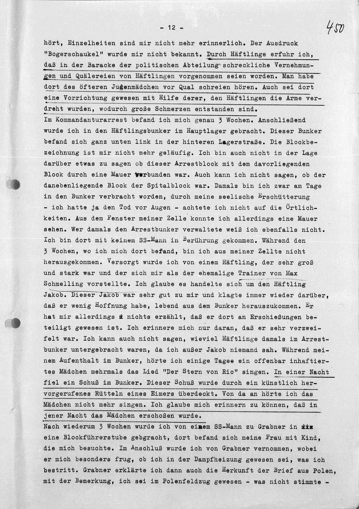 Im Kommandanturarrest befand ich mich genau 3 Wochen. Anschließend wurde ich in den Häftlingsbunker im Hauptlager gebracht. Dieser Bunker befand sich ganz unten links in der hinteren Lagerstraße. Die Blockbezeichnung ist mir nicht mehr geläufig. Ich bin auch nicht in der Lage darüber etwas zu sagen ob dieser Arrestblock mit den davorliegenden Block durch eine Mauer verbunden war. Auch kann ich nicht sagen, ob der danebenliegende Block der Spitalblock war. Damals bin ich zwar am Tage in den Bunker verbracht worden, durch meine seelische Erschütterung – ich hatte ja den Tod vor Augen – achtete ich nicht auf die Örtlichkeiten. Aus dem Fenster meiner Zelle konnte ich allerdings eine Mauer sehen. Wer damals den Arrestbunker verwaltete weiß ich ebenfalls nicht. Ich bin dort mit keinem SS-Mann in Berührung gekommen. Während den 3 Wochen, wo ich mich dort befand, bin ich aus meiner Zelle nicht herausgekommen. Versorgt wurde ich von einem Häftling, der sehr groß und stark war und der sich mir als der ehemalige Trainer von Max Schmelling vorstellte. Ich glaube es handelte sich um den Häftling Jakob. Dieser Jakob war sehr gut zu mir und klagte immer wieder darüber, daß er wenig Hoffnung habe, lebend aus dem Bunker herauszukommen. Er hat mir allerdings nichts erzählt, daß er dort an Erschießungen beteiligt gewesen ist. Ich erinnere mich nur daran, daß er sehr verzweifelt war. Ich kann auch nicht sagen, wieviel Häftlinge damals im Arrestbunker untergebracht waren, da ich außer Jakob niemand sah. Während meinem Aufenthalt im Bunker, hörte ich einige Tage ein offenbar inhaftiertes Mädchen mehrmals das Lied „Der Stern von Rio“ singen. In einer Nacht fiel ein Schuß im Bunker. Dieser Schuß wurde durch ein künstlich hervorgerufenes Rütteln eines Eimers überdeckt. Von da an hörte ich das Mädchen nicht mehr singen. Ich glaube mich erinnern zu können, daß in jener Nacht das Mädchen erschossen wurde.