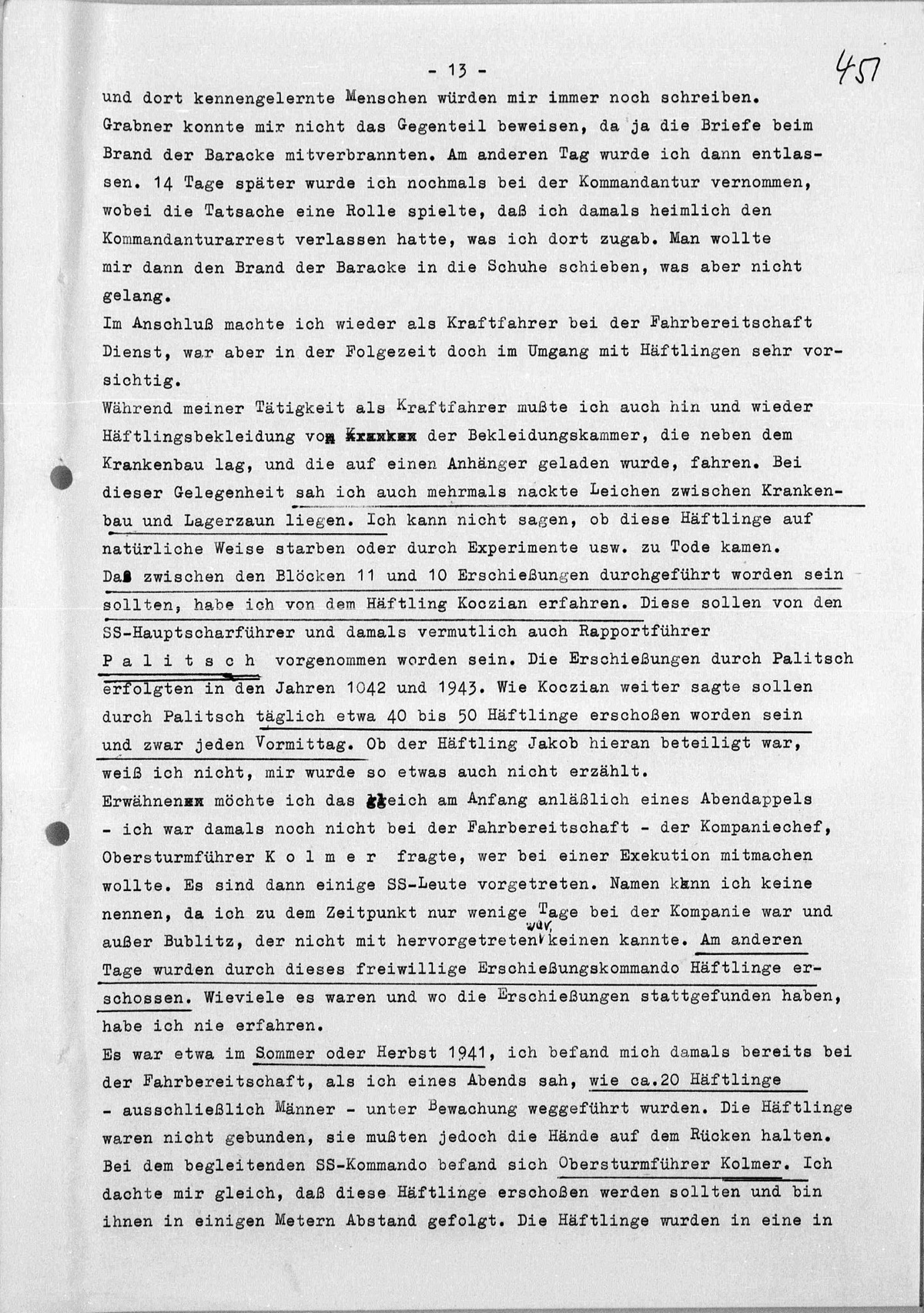 I learned from the prisoner Koczian that executions were said to have taken place between Blocks 11 and 10. These were reportedly carried out by SS-Hauptscharführer—and likely also at the time by Rapportführer—Palitsch. According to Koczian, the executions by Palitsch took place in 1942 and 1943. He also said that Palitsch allegedly shot about 40 to 50 prisoners daily—always in the morning. Whether the prisoner Jakob was involved in this, I do not know; nothing of the sort was told to me.