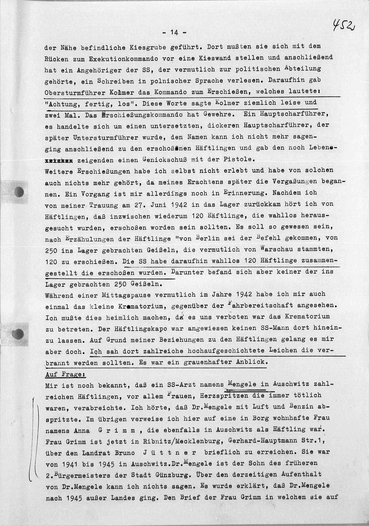 Mir ist noch bekannt, daß ein SS-Arzt namens Mengele in Auschwitz zahlreichen Häftlingen, vor allem Frauen, Herzspritzen die immer tödlich waren, verabreichte. Ich hörte, daß Dr. Mengele mit Luft und Benzin abspritzte. Im übrigen verweise ich hier auf eine in Borg wohnhafte Frau namens Anna Grimm, die ebenfalls in Auschwitz als Häftling war.