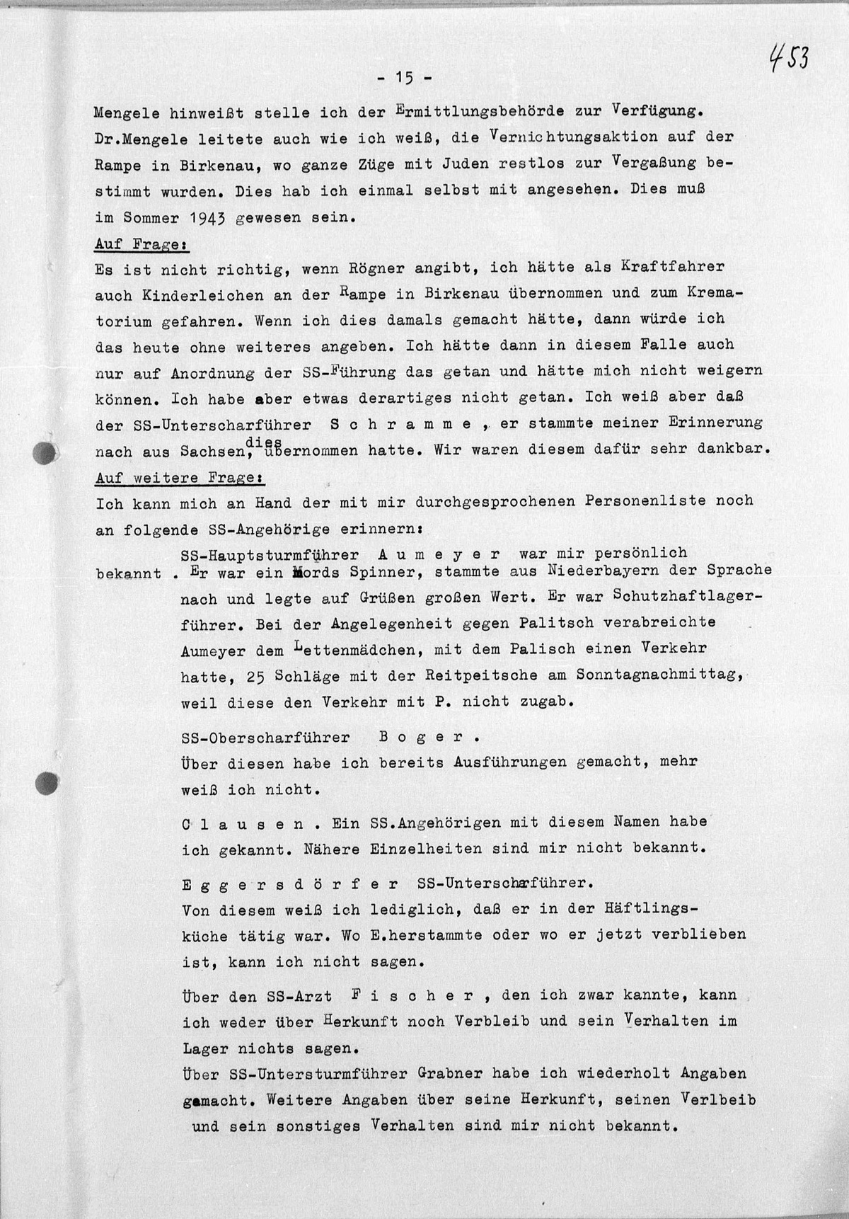 Es ist nicht richtig, wenn Rögner angibt, ich hätte als Kraftfahrer auch Kinderleichen an der Rampe in Birkenau übernommen und zum Krematorium gefahren. Wenn ich dies damals gemacht hätte, dann würde ich das heute ohne weiteres angeben. Ich hätte dann in diesem Falle auch nur auf Anordnung der SS-Führung das getan und hätte mich nicht weigern können. Ich habe aber etwas derartiges nicht getan. Ich weiß aber daß der SS-Unterscharführer Schramme, er stammte meiner Erinnerung nach aus Sachsen, dies übernommen hatte. Wir waren diesem dafür sehr dankbar.