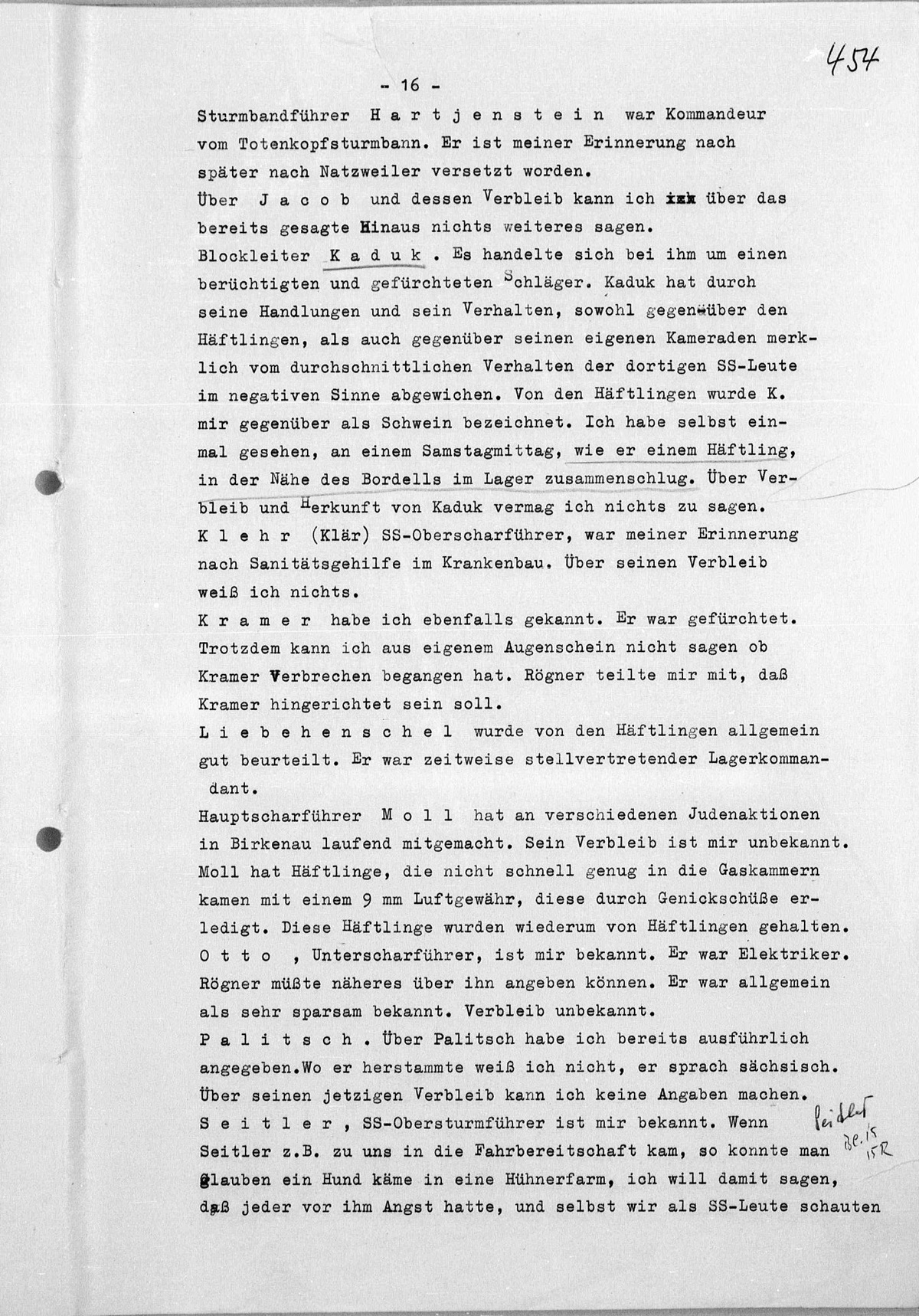 Block leader Kaduk. He was a notorious and feared thug. Through his actions and behavior—both toward the prisoners and his own comrades—Kaduk clearly deviated negatively from the average conduct of the SS men there. Prisoners referred to K. in my presence as a pig. I once saw him myself, on a Saturday afternoon, beating a prisoner near the camp brothel. I am unable to say anything about Kaduk’s origin or current whereabouts.