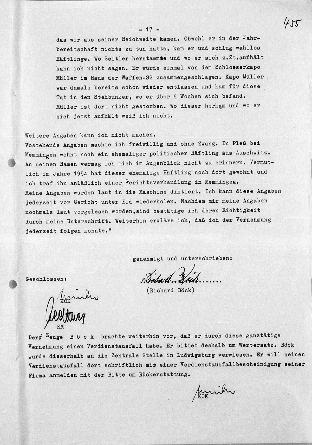 Wie schon bemerkt glaube ich aber durch meine menschliche Haltung, während meiner Tätigkeit im KZ Auschwitz bewiesen zu haben, daß auch SS-Leute in der damaligen Zeit sich anständig gegenüber den Häftlingen verhalten haben. Meine menschliche Haltung wurde mir nach 1945 z.T. durch ehemalige Auschwitzhäftlinge schriftlich bestätigt. Beglaubigte Unterlagen solcher eidesstattlicher Erklärungen habe ich anläßlich meiner Vernehmung vorgelegt. Entsprechende Kopien, die allerdings z.T. nicht beglaubigt sind, die aber mit den beglaubigten Unterlagen übereinstimmen, können meiner Vernehmung beigefügt werden.