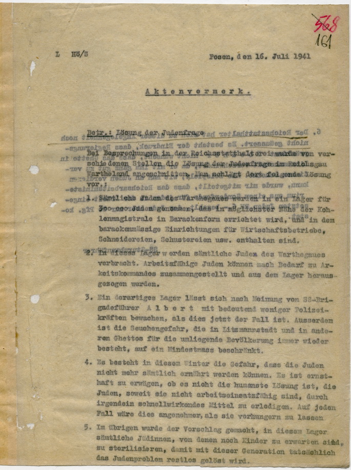 Bei Besprechungen in der Reichsstatthalterei wurde von verschiedenen Stellen die Lösung der Judenfrage im Reichsgau Wartheland angeschnitten. Man schlägt dort folgende Lösung vor:
