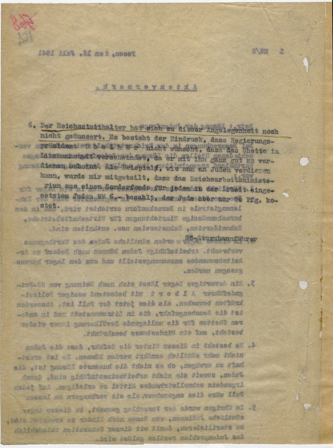 6. The Reichsstatthalter has not yet commented on this matter. There is the impression that Government President Übelhör does not want the ghetto in Litzmannstadt to disappear, as he seems to be making quite a profit from it. As an example of how one can profit from Jews, I was informed that the Reich Ministry of Labor pays RM 6 from a special fund for every Jew employed in work, but the Jew costs only 80 Pfg.